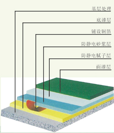 | 面漆層 | 輥涂或噴涂環(huán)氧防靜電面涂材料 | 防靜電環(huán)氧面漆 | — | 0.20~0.30kg/m2 |